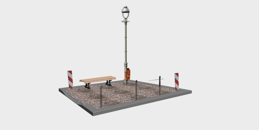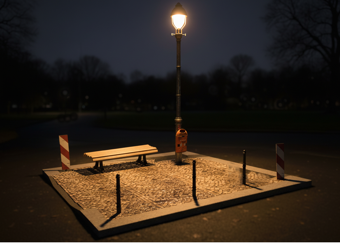 Auf der für die Kunst am Bau zur Verfügung stehenden 20 m² großen Fläche im hinteren Teil des Schulgartens sieht der Siegerentwurf vor, ein Stück des öffentlichen Raums aus der Umgebung der Schule in allen Details nachzubauen. Der Bereich wird gepflastert und mit Granitborden eingefasst. Gusspoller, Schilder, eine Laterne mit Abfalleimer und eine Parkbank ergänzen das Ensemble. Was im Stadtraum selbstverständlich ist, wird im geschützten Raum der Schule zum Irritationsmoment: ein „Fremdkörper“. Das Werk greift zentrale Themen der zeitgenössischen Kunst im öffentlichen Raum auf: das Wechselspiel zwischen Alltäglichkeit und ästhetischer Setzung, die Verschiebung von Bedeutungsräumen und die aktive Auseinandersetzung der Betrachter*innen mit ihrem Umfeld.